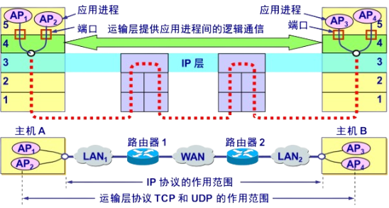 - 当网络的边缘部分中的两个主机使用网络的核心部分功能进行通信时,只有位于网络边缘的主机的协议栈才有运输层